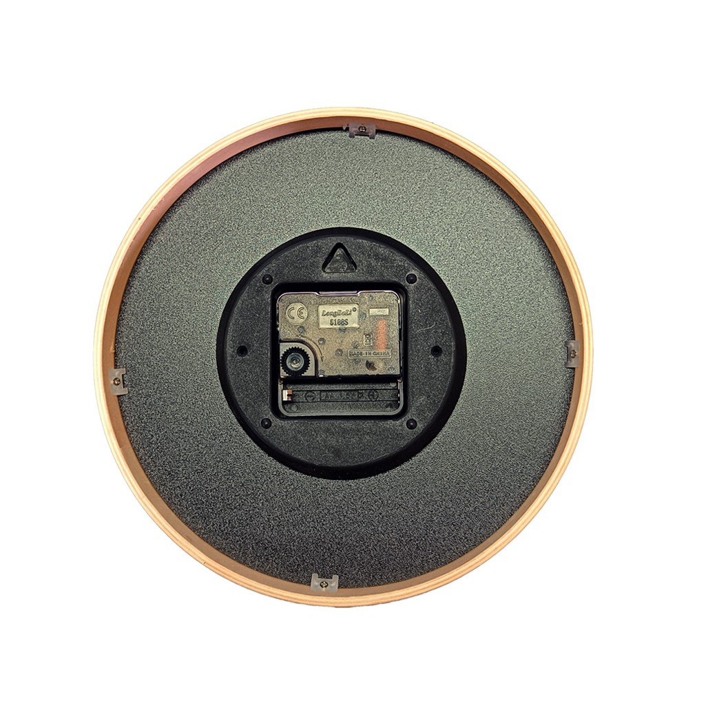 En stilig veggklokke laget av lyst tre, med svart urskive. Klokken har en lydløs bevegelse.