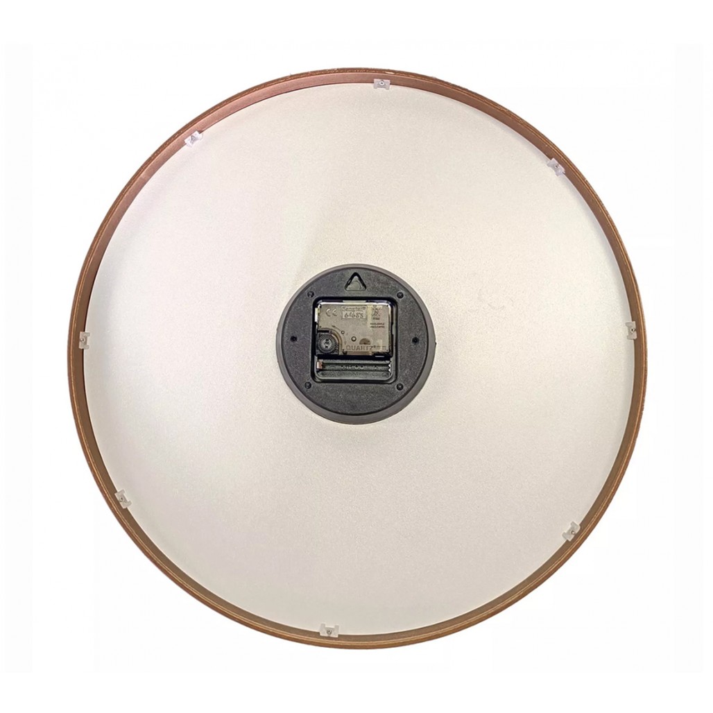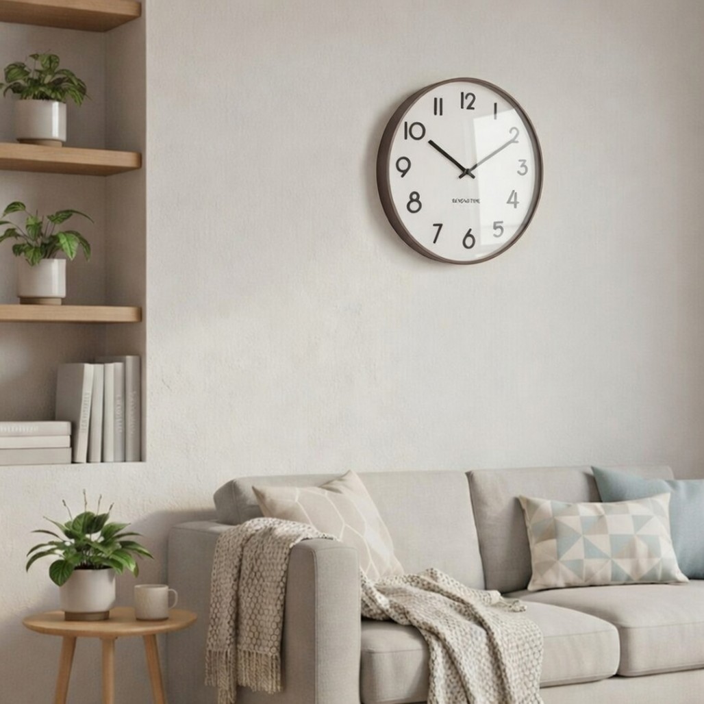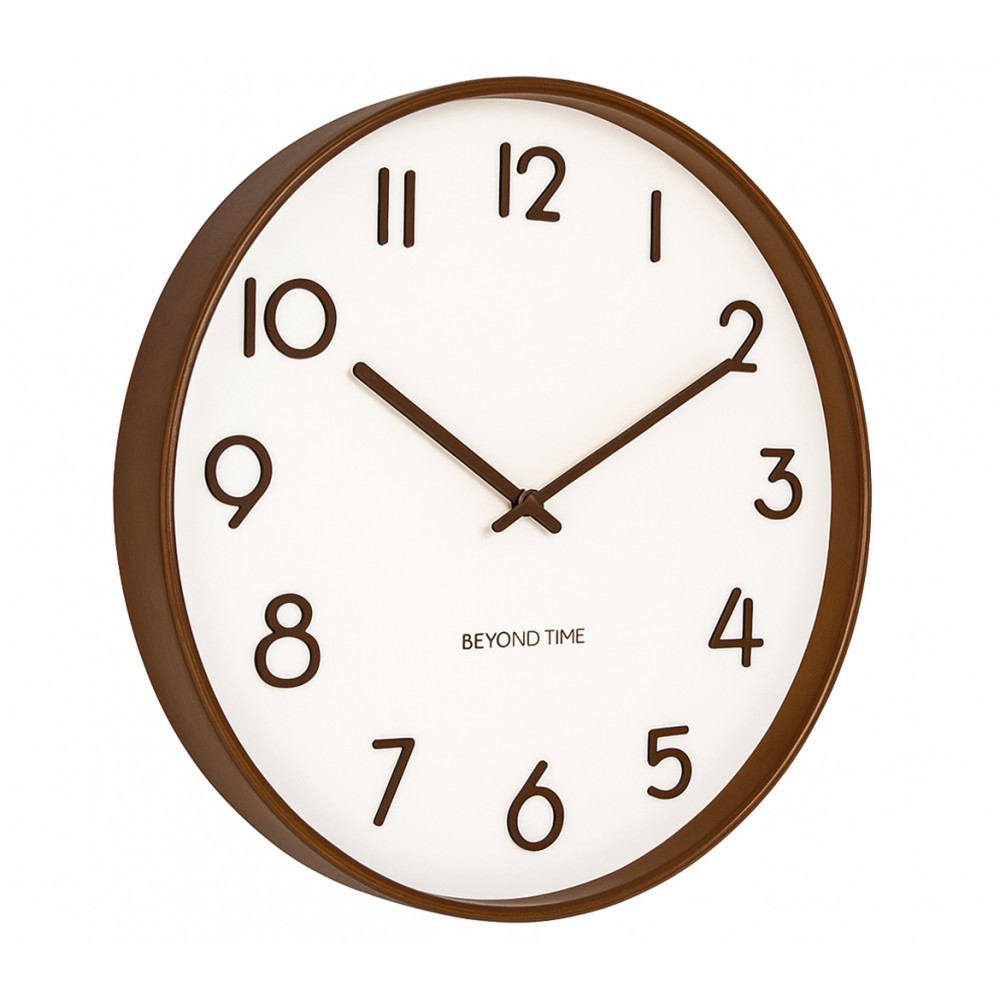En stor og stilig veggklokke laget av mørkt treverk, med hvit urskive. Klokken har en lydløs bevegelse.
