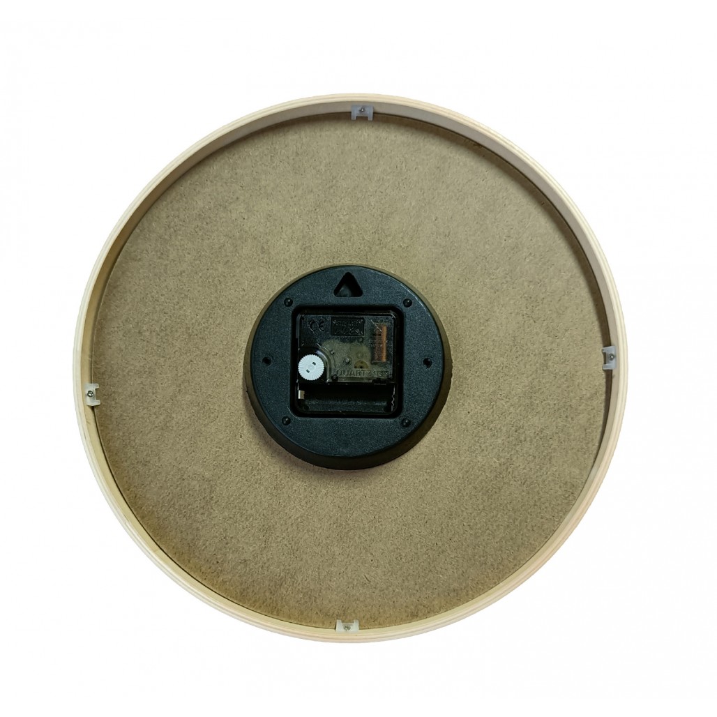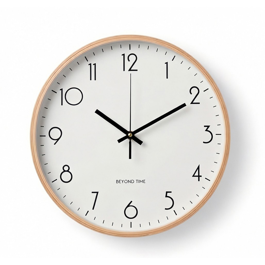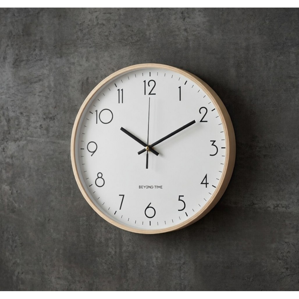 En elegant veggklokke med treramme og hvit urskive, som passer perfekt både hjemme og på kontoret. Veggklokkens sekundviser sveiper fremover, noe som betyr at den er stillegående og du ikke trenger å bekymre deg for tikkelyder.
